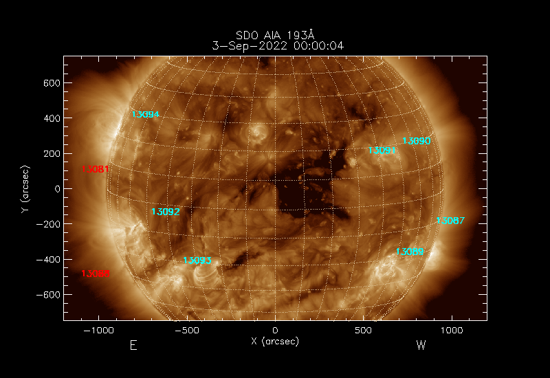 Click on an Active Region plot to display the Region Report including the region evolution and flaring history. HEC Search for NOAA Active Regions (SRS) records for this date and the day before.