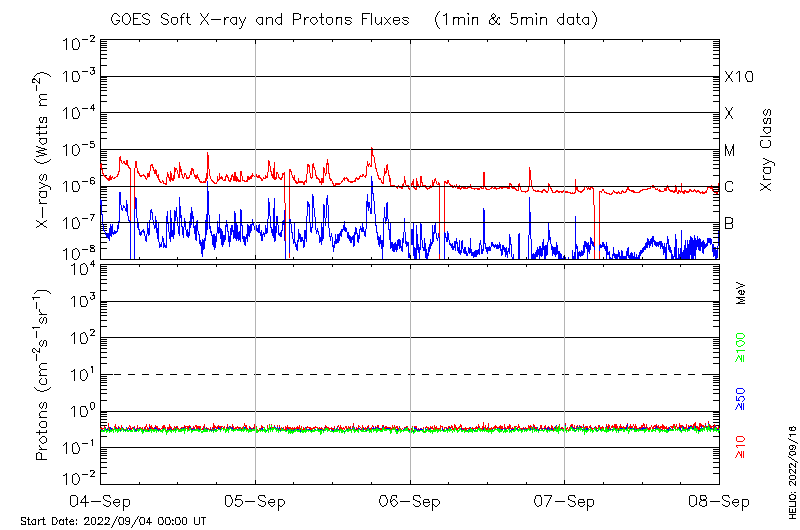 This page provides light-curves generated from GOES soft X-ray and Particle data for the date indicated at the top and the preceding three days.