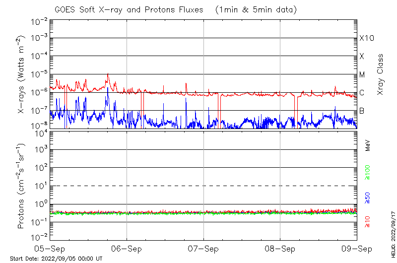 This page provides light-curves generated from GOES soft X-ray and Particle data for the date indicated at the top and the preceding three days.