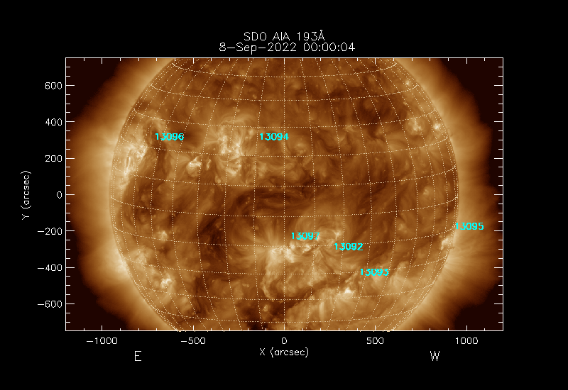Click on an Active Region plot to display the Region Report including the region evolution and flaring history. HEC Search for NOAA Active Regions (SRS) records for this date and the day before.