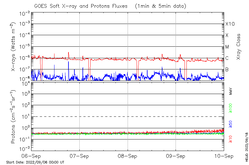 This page provides light-curves generated from GOES soft X-ray and Particle data for the date indicated at the top and the preceding three days.