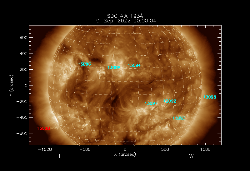 Click on an Active Region plot to display the Region Report including the region evolution and flaring history. HEC Search for NOAA Active Regions (SRS) records for this date and the day before.