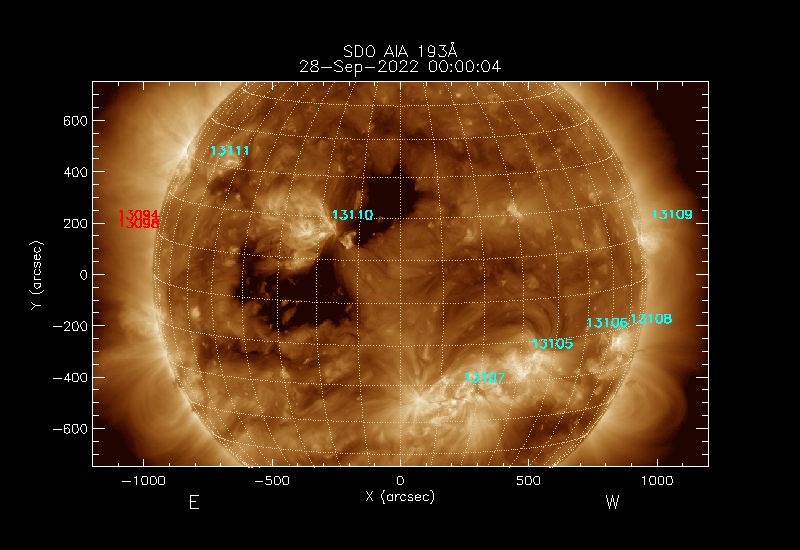 Click on an Active Region plot to display the Region Report including the region evolution and flaring history. HEC Search for NOAA Active Regions (SRS) records for this date and the day before.