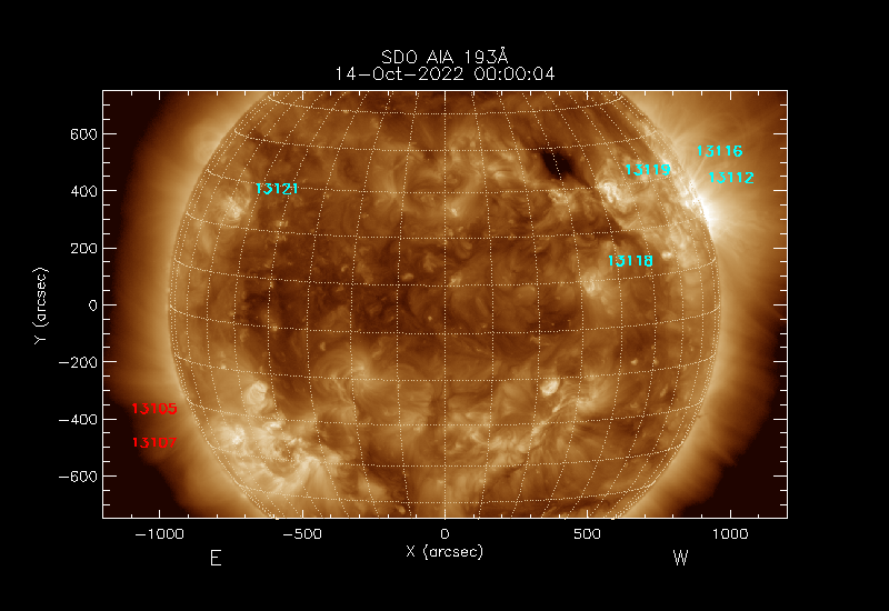 Click on an Active Region plot to display the Region Report including the region evolution and flaring history. HEC Search for NOAA Active Regions (SRS) records for this date and the day before.