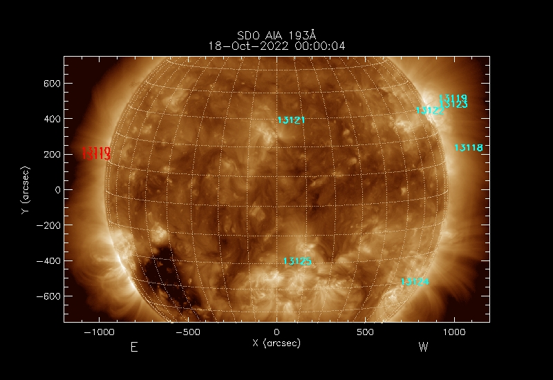 Click on an Active Region plot to display the Region Report including the region evolution and flaring history. HEC Search for NOAA Active Regions (SRS) records for this date and the day before.