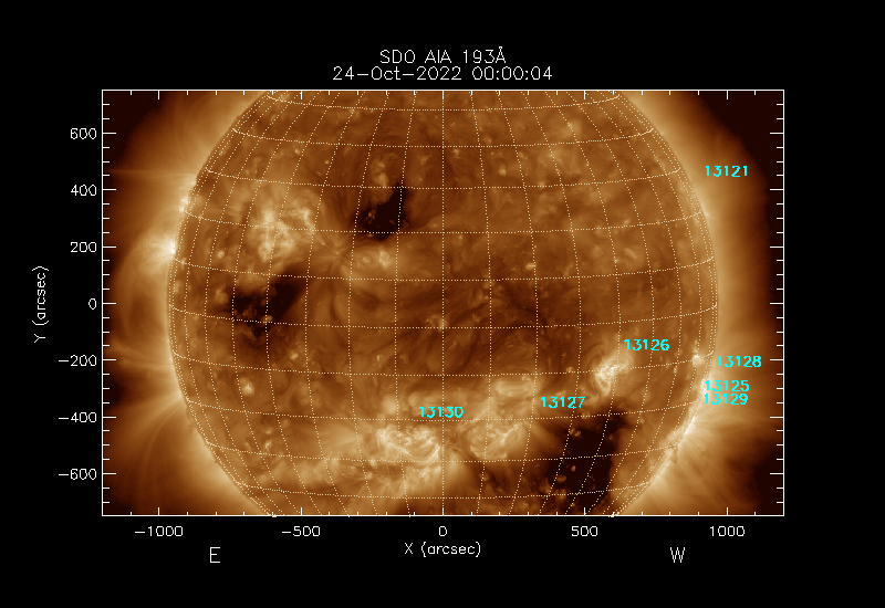 Click on an Active Region plot to display the Region Report including the region evolution and flaring history. HEC Search for NOAA Active Regions (SRS) records for this date and the day before.