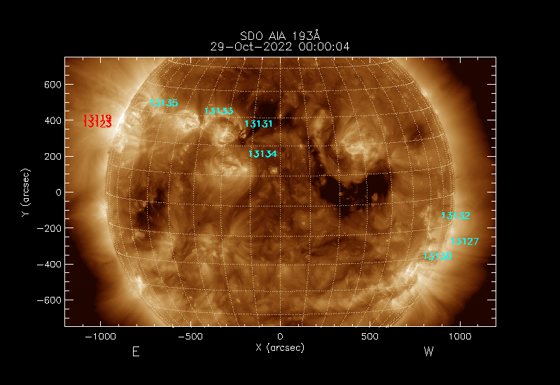Click on an Active Region plot to display the Region Report including the region evolution and flaring history. HEC Search for NOAA Active Regions (SRS) records for this date and the day before.