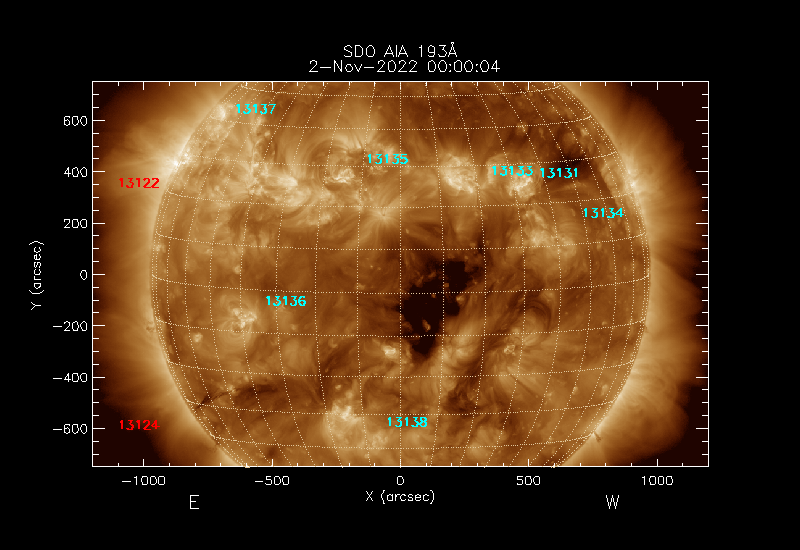 Click on an Active Region plot to display the Region Report including the region evolution and flaring history. HEC Search for NOAA Active Regions (SRS) records for this date and the day before.