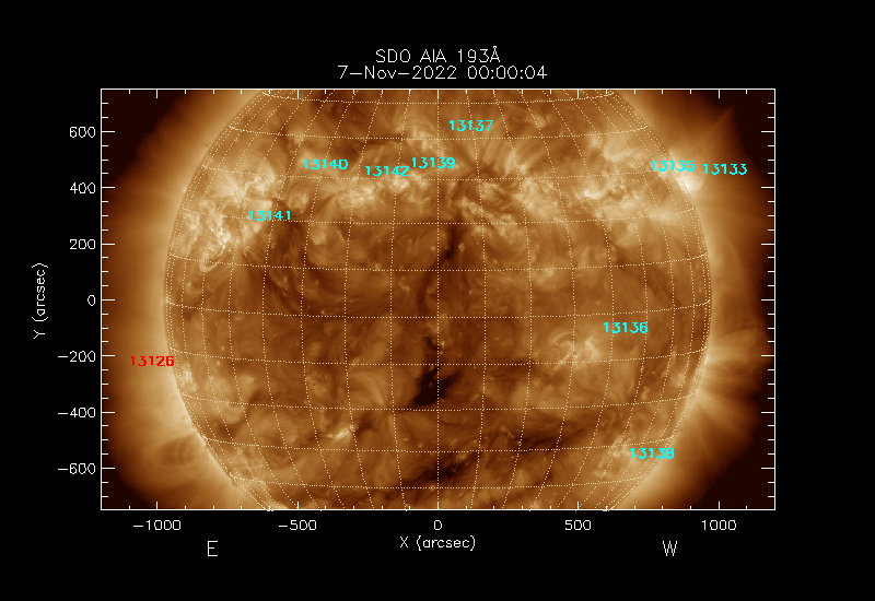 Click on an Active Region plot to display the Region Report including the region evolution and flaring history. HEC Search for NOAA Active Regions (SRS) records for this date and the day before.