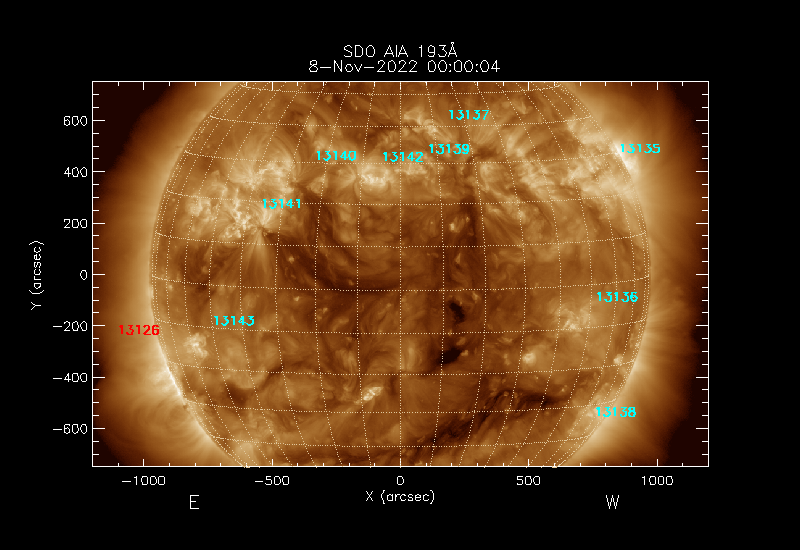 Click on an Active Region plot to display the Region Report including the region evolution and flaring history. HEC Search for NOAA Active Regions (SRS) records for this date and the day before.