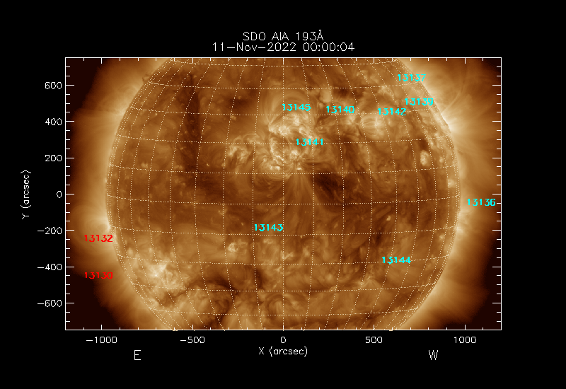 Click on an Active Region plot to display the Region Report including the region evolution and flaring history. HEC Search for NOAA Active Regions (SRS) records for this date and the day before.