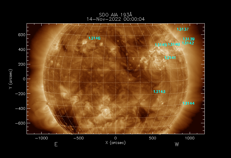 Click on an Active Region plot to display the Region Report including the region evolution and flaring history. HEC Search for NOAA Active Regions (SRS) records for this date and the day before.