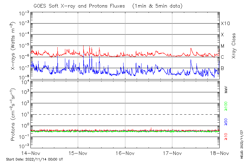 This page provides light-curves generated from GOES soft X-ray and Particle data for the date indicated at the top and the preceding three days.