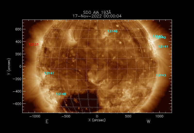 Click on an Active Region plot to display the Region Report including the region evolution and flaring history. HEC Search for NOAA Active Regions (SRS) records for this date and the day before.