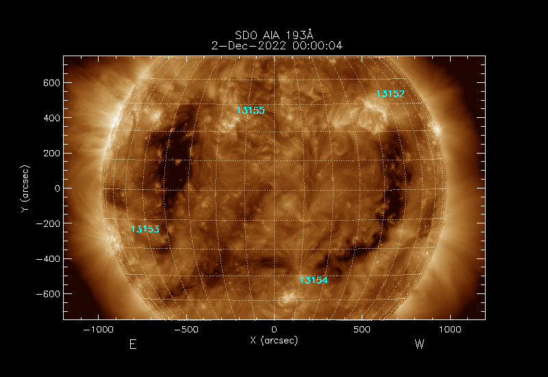 Click on an Active Region plot to display the Region Report including the region evolution and flaring history. HEC Search for NOAA Active Regions (SRS) records for this date and the day before.