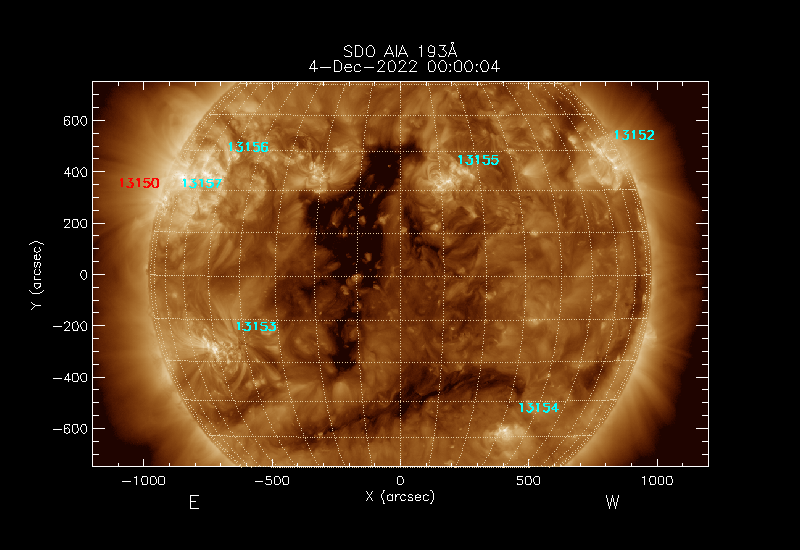 Click on an Active Region plot to display the Region Report including the region evolution and flaring history. HEC Search for NOAA Active Regions (SRS) records for this date and the day before.