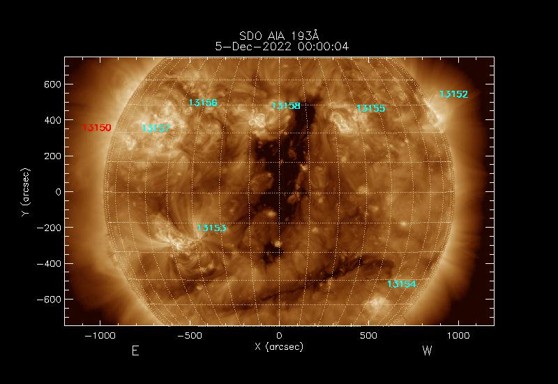 Click on an Active Region plot to display the Region Report including the region evolution and flaring history. HEC Search for NOAA Active Regions (SRS) records for this date and the day before.