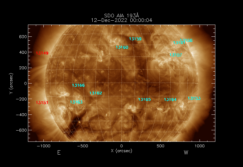 Click on an Active Region plot to display the Region Report including the region evolution and flaring history. HEC Search for NOAA Active Regions (SRS) records for this date and the day before.