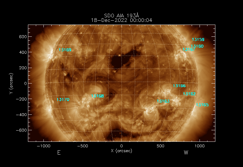 Click on an Active Region plot to display the Region Report including the region evolution and flaring history. HEC Search for NOAA Active Regions (SRS) records for this date and the day before.