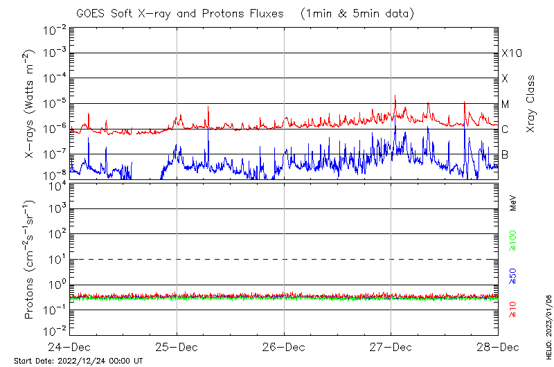 This page provides light-curves generated from GOES soft X-ray and Particle data for the date indicated at the top and the preceding three days.