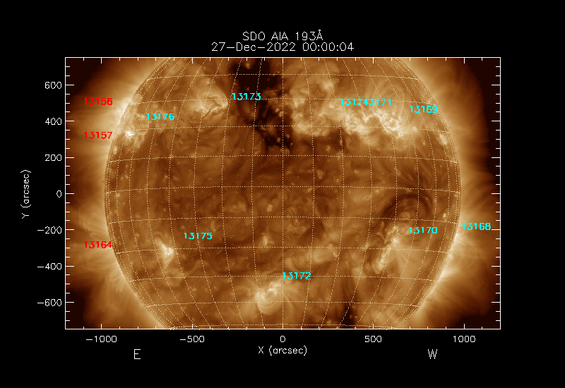 Click on an Active Region plot to display the Region Report including the region evolution and flaring history. HEC Search for NOAA Active Regions (SRS) records for this date and the day before.