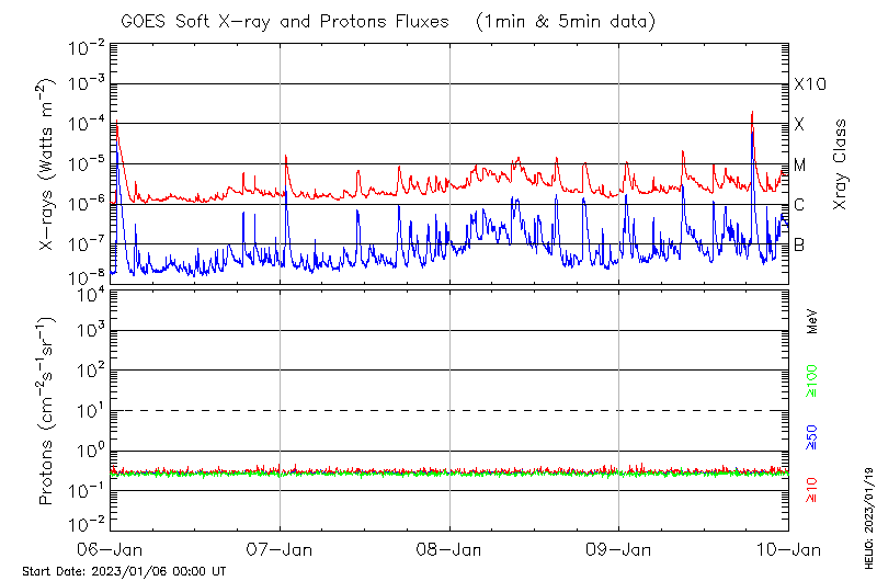 This page provides light-curves generated from GOES soft X-ray and Particle data for the date indicated at the top and the preceding three days.