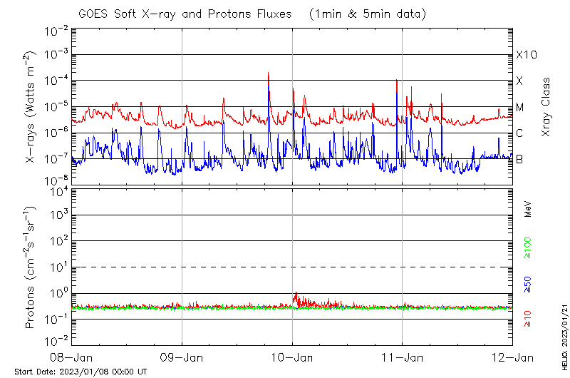 This page provides light-curves generated from GOES soft X-ray and Particle data for the date indicated at the top and the preceding three days.