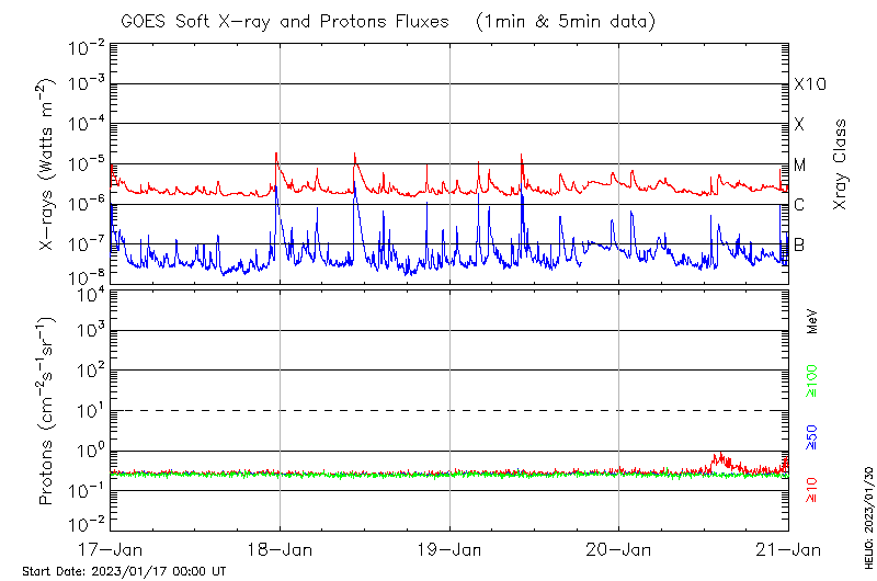 This page provides light-curves generated from GOES soft X-ray and Particle data for the date indicated at the top and the preceding three days.