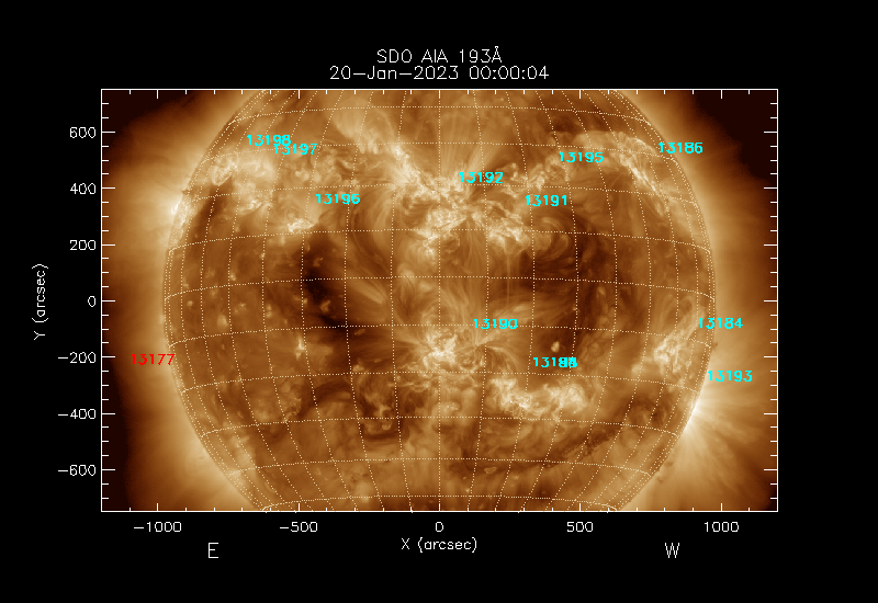 Click on an Active Region plot to display the Region Report including the region evolution and flaring history. HEC Search for NOAA Active Regions (SRS) records for this date and the day before.