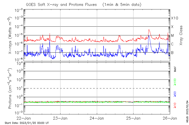 This page provides light-curves generated from GOES soft X-ray and Particle data for the date indicated at the top and the preceding three days.
