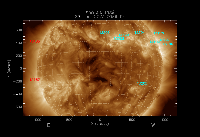 Click on an Active Region plot to display the Region Report including the region evolution and flaring history. HEC Search for NOAA Active Regions (SRS) records for this date and the day before.