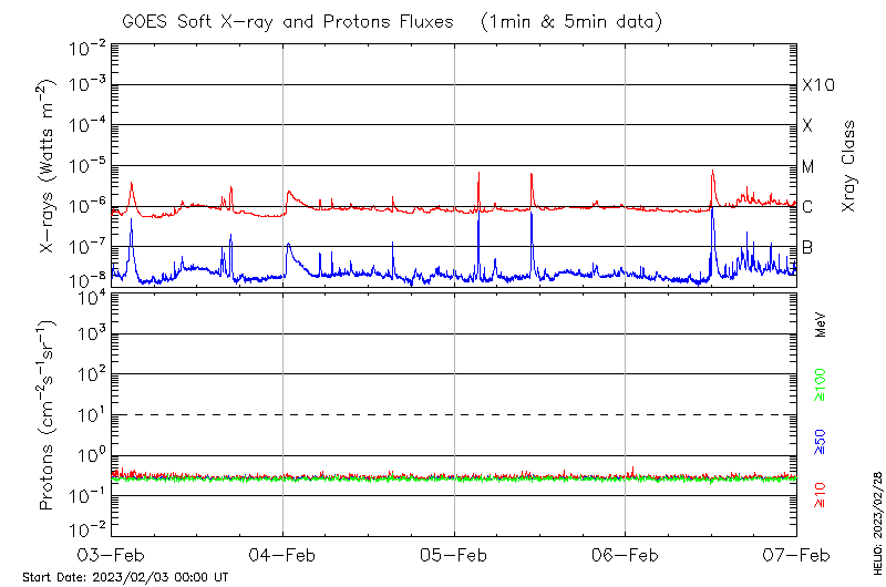 This page provides light-curves generated from GOES soft X-ray and Particle data for the date indicated at the top and the preceding three days.