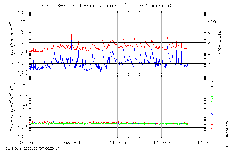 This page provides light-curves generated from GOES soft X-ray and Particle data for the date indicated at the top and the preceding three days.