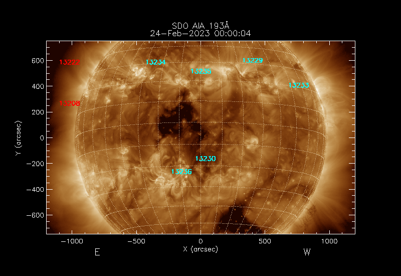 Click on an Active Region plot to display the Region Report including the region evolution and flaring history. HEC Search for NOAA Active Regions (SRS) records for this date and the day before.