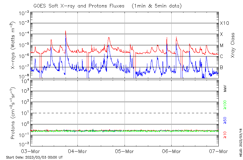 This page provides light-curves generated from GOES soft X-ray and Particle data for the date indicated at the top and the preceding three days.