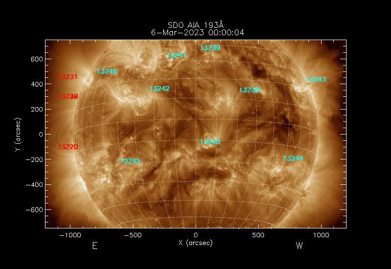 Click on an Active Region plot to display the Region Report including the region evolution and flaring history. HEC Search for NOAA Active Regions (SRS) records for this date and the day before.