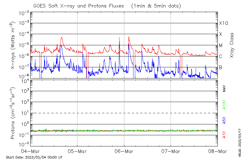 This page provides light-curves generated from GOES soft X-ray and Particle data for the date indicated at the top and the preceding three days.