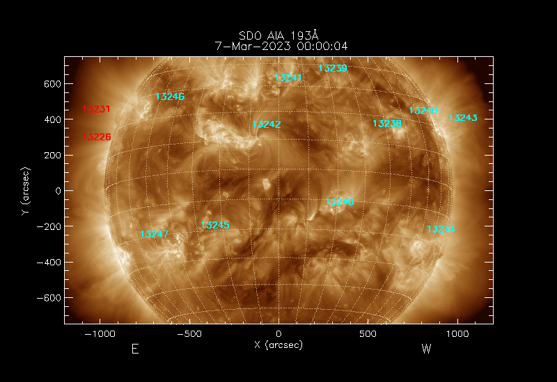 The 5 digit numbers in turquoise designate Active Regions;