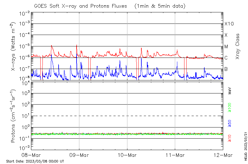 This page provides light-curves generated from GOES soft X-ray and Particle data for the date indicated at the top and the preceding three days.