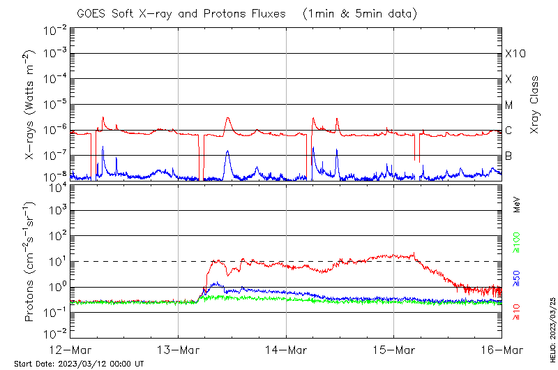 This page provides light-curves generated from GOES soft X-ray and Particle data for the date indicated at the top and the preceding three days.