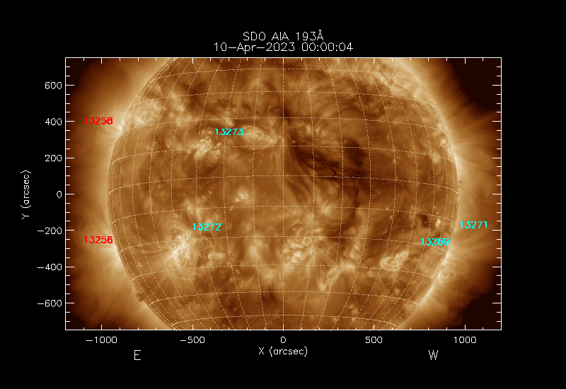 Click on an Active Region plot to display the Region Report including the region evolution and flaring history. HEC Search for NOAA Active Regions (SRS) records for this date and the day before.