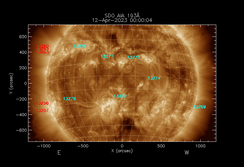 Click on an Active Region plot to display the Region Report including the region evolution and flaring history. HEC Search for NOAA Active Regions (SRS) records for this date and the day before.