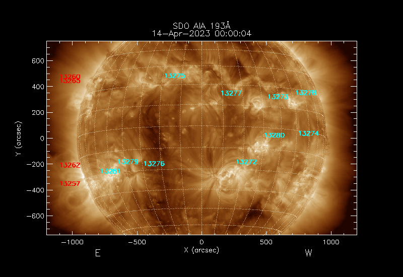 Click on an Active Region plot to display the Region Report including the region evolution and flaring history. HEC Search for NOAA Active Regions (SRS) records for this date and the day before.