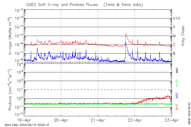 This page provides light-curves generated from GOES soft X-ray and Particle data for the date indicated at the top and the preceding three days.