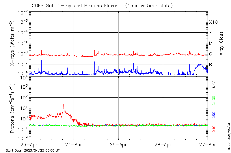 This page provides light-curves generated from GOES soft X-ray and Particle data for the date indicated at the top and the preceding three days.
