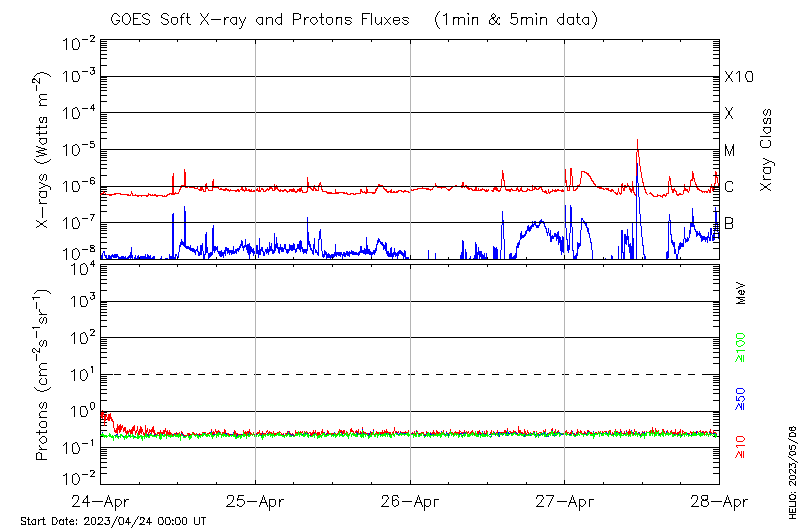 This page provides light-curves generated from GOES soft X-ray and Particle data for the date indicated at the top and the preceding three days.