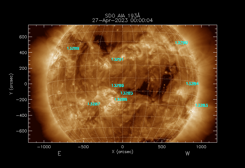 Click on an Active Region plot to display the Region Report including the region evolution and flaring history. HEC Search for NOAA Active Regions (SRS) records for this date and the day before.