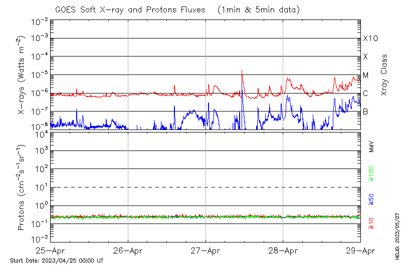 This page provides light-curves generated from GOES soft X-ray and Particle data for the date indicated at the top and the preceding three days.