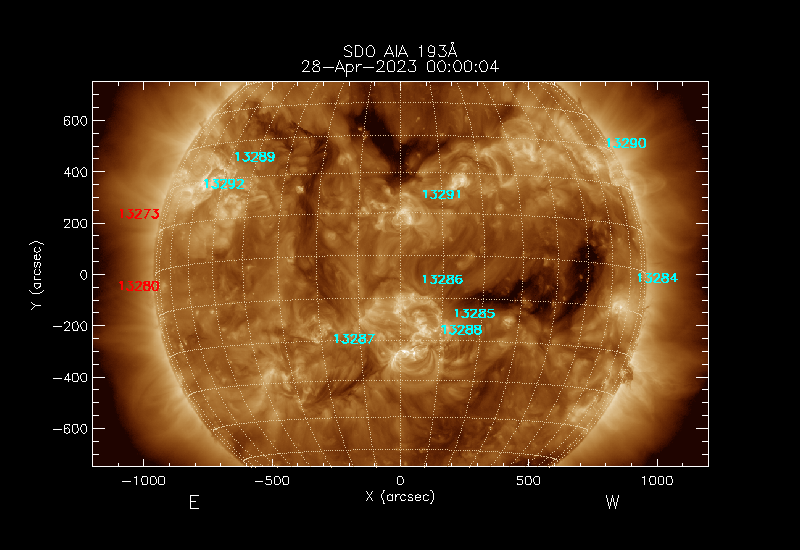 Click on an Active Region plot to display the Region Report including the region evolution and flaring history. HEC Search for NOAA Active Regions (SRS) records for this date and the day before.