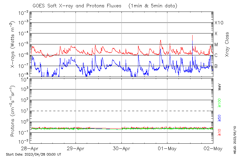 This page provides light-curves generated from GOES soft X-ray and Particle data for the date indicated at the top and the preceding three days.